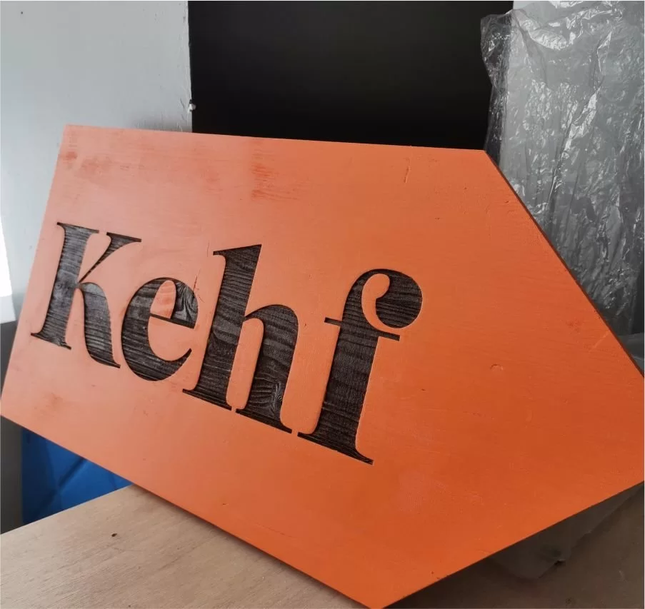 Lazer kesim yazılar, oyma detaylar ve kabartma tipografi kullanılarak tasarlanan dekoratif tabelalar mekânın konseptini tamamlar.